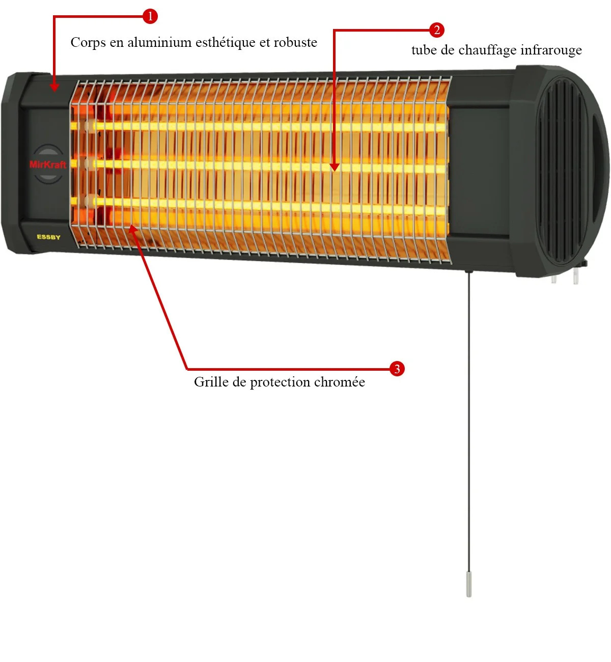 - Le radiateur infrarouge à quartz chauffe la pièce et les objets qui s’y trouvent.
