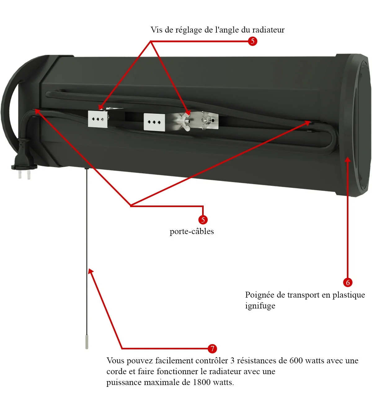 - Les crochets du radiateur infrarouge peuvent être fixés au mur et au plafond afin de ne pas vous déranger lors du chauffage.