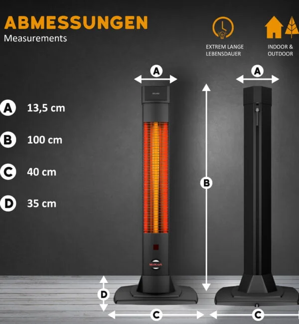 - INNENRAUM UND AUSSEN: Sie können Ihre Terassenheizstrahler bedenkenlos in Wohnzimmer, Wohnung, Balkon, Terrasse, Garage, Wintergarten, Außenbereich und Werkstatt nutzen.